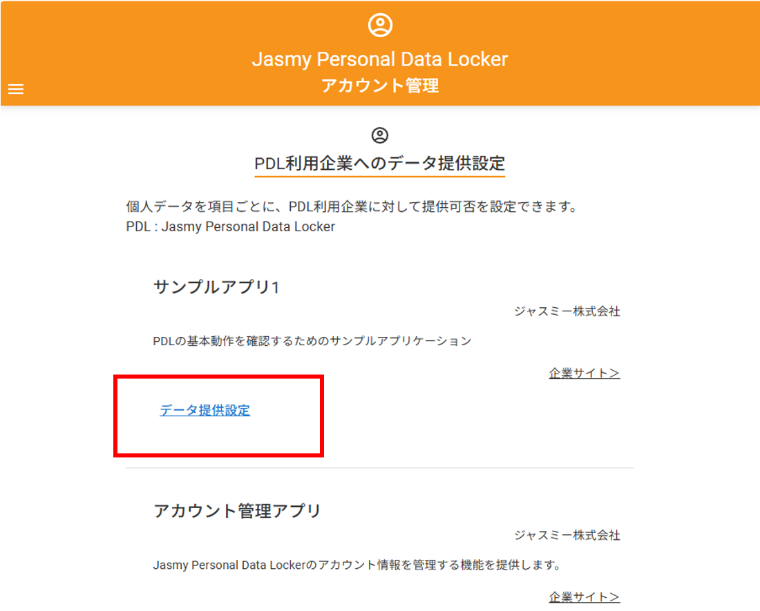 「PDL利用企業へのデータ提供設定」画面が表示され、データの提供対象のアプリが表示されます。